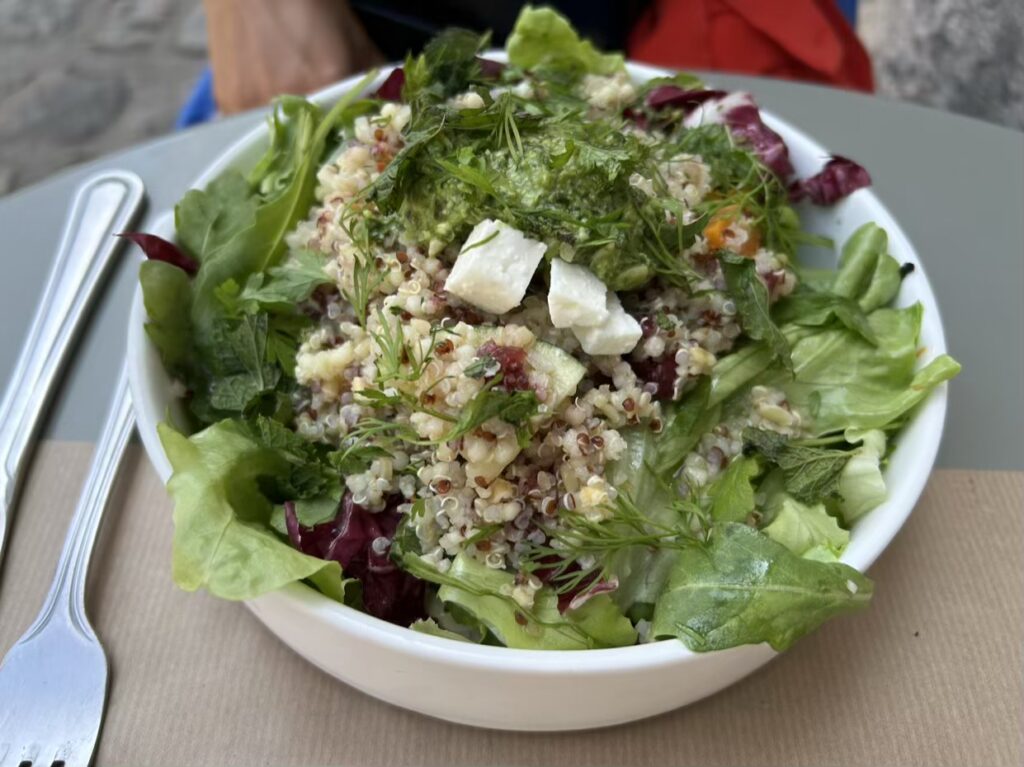 カマルグ産赤米のサラダは、南仏カマルグ地方で育った赤米のぷちぷちとした食感に、ロースト&生の季節野菜のフレッシュな甘みと香ばしさが重なります。そこにフェタチーズのほのかな塩気、クランベリーの優しい酸味、そしてハーブとほうれん草&ミントのペストが絡み合い、口の中で爽やかな風が吹くような味わいに。見た目もカラフルで、思わず写真を撮りたくなる美しさです。