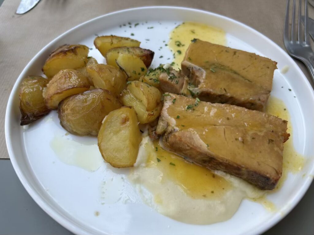 仔牛の胸肉は白ワインとパセリバターでじっくりと低温調理されており、ナイフを入れた瞬間にほろっとほどけるほど柔らか。豆の名産地・ヴァンデ地方のモジェット豆を使ったクリームは、ふんわりとした甘みと滑らかな口当たりで、肉の旨味をやさしく包み込みます。付け合わせのローストポテトは外はカリッと中はホクホクで、香ばしさが全体を引き締めてくれます。