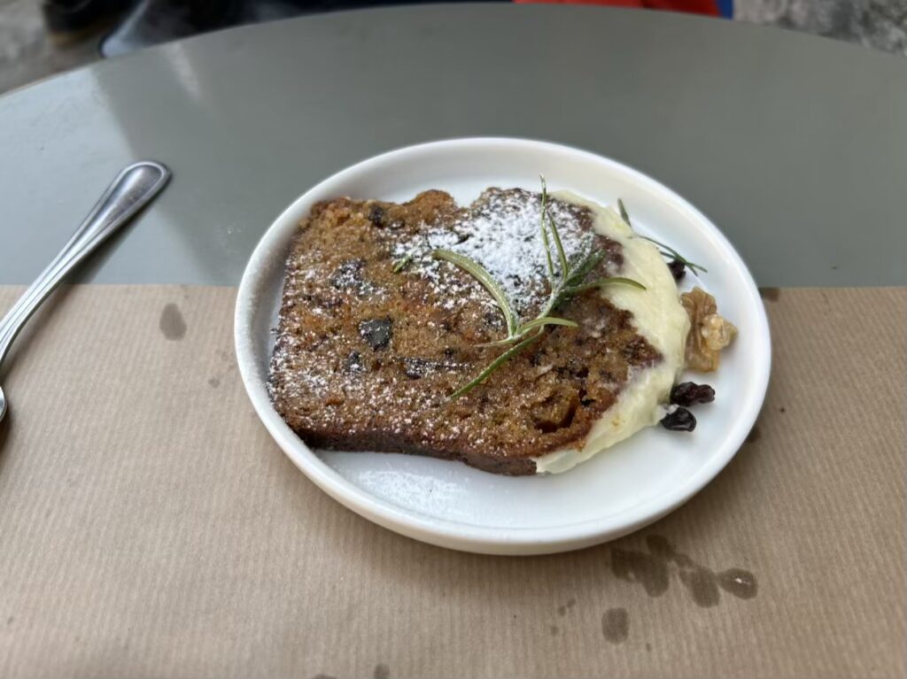 - クルミとレーズン、ローズマリー入りキャロットケーキ、クリームチーズアイシング