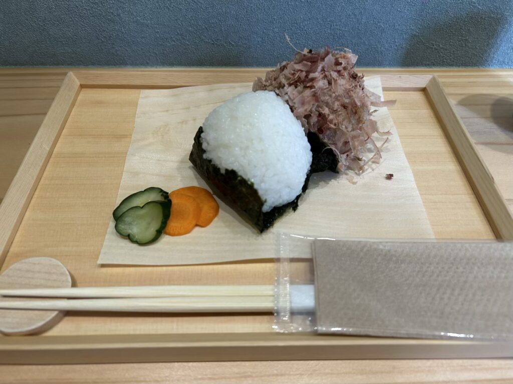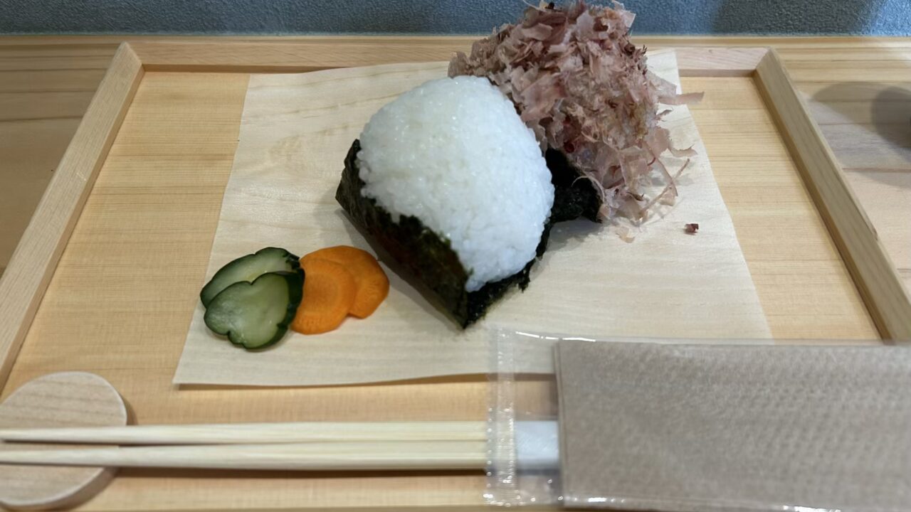 I ordered two classic rice balls — the Iwato Salt Musubi (¥250) and the Freshly Shaved Bonito Flakes Musubi (¥330).
